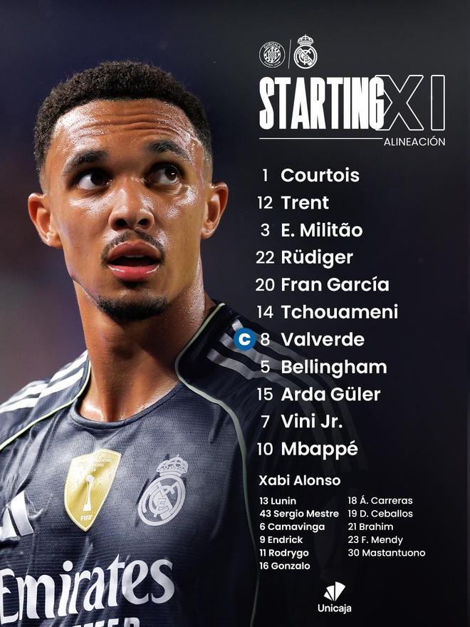 替补:13-卢宁、43-梅斯特雷、6-卡马文加、9-恩德里克、11-罗德里戈、16-贡萨洛、18-卡雷拉斯、19-塞瓦略斯、21-卜拉欣-迪亚斯、23-费兰-门迪、30-马斯坦托诺